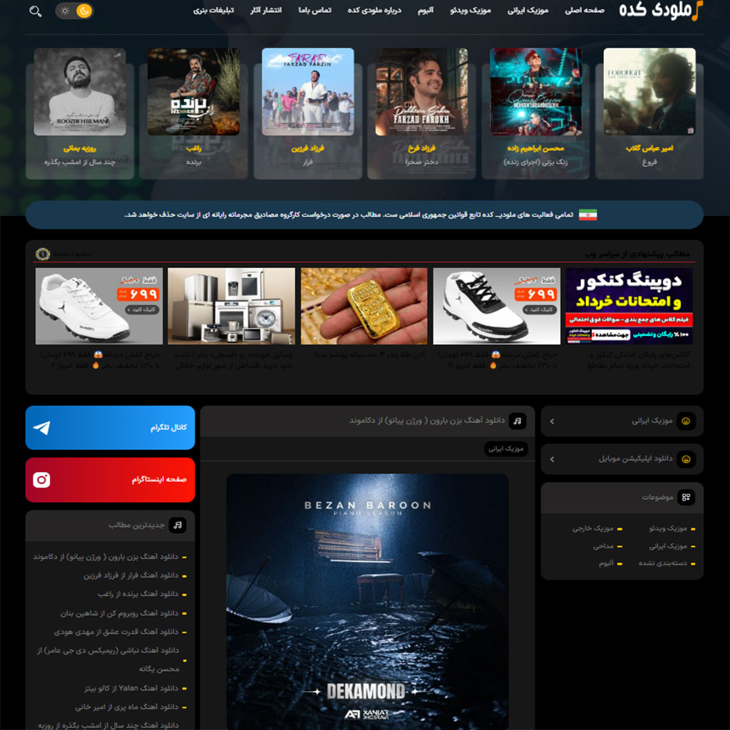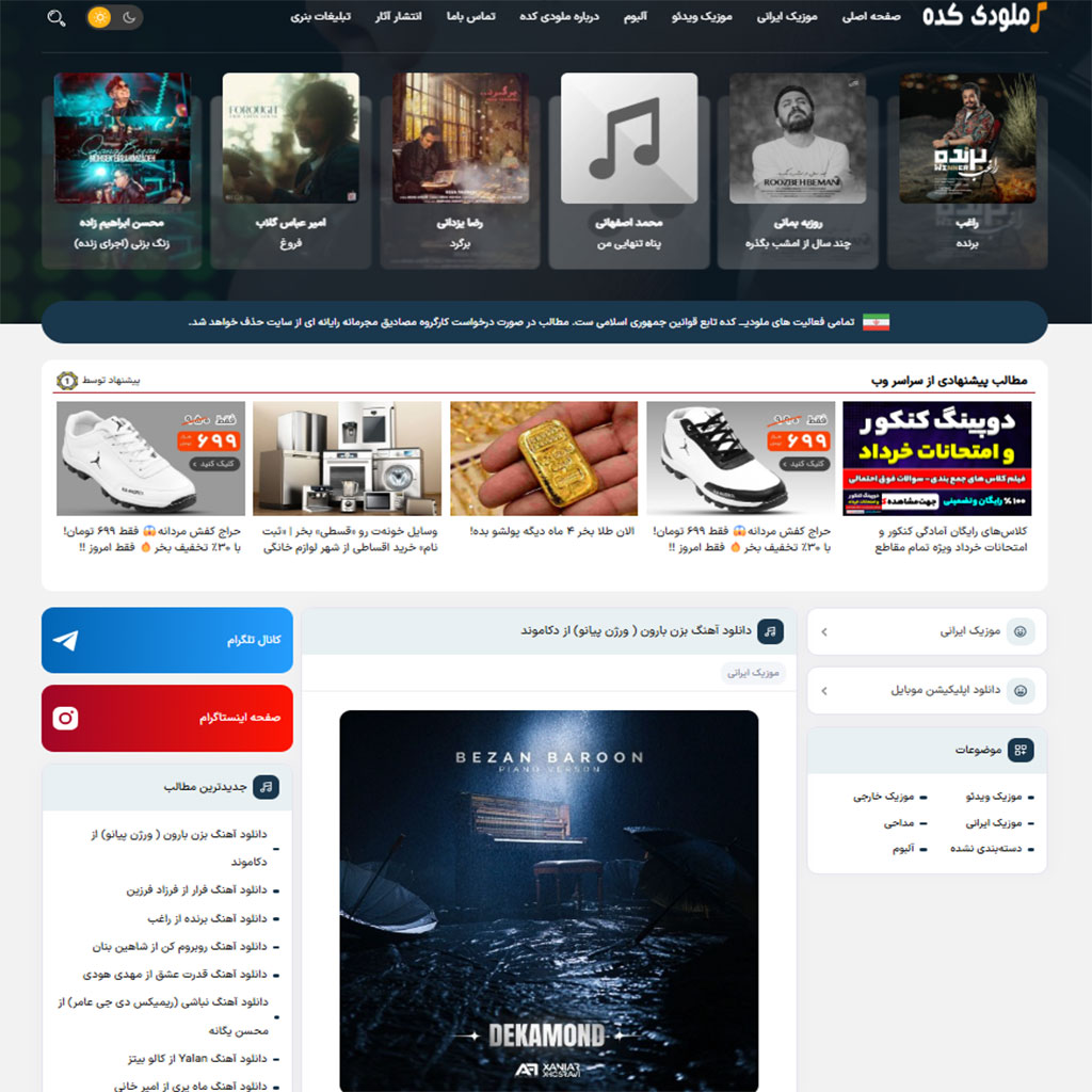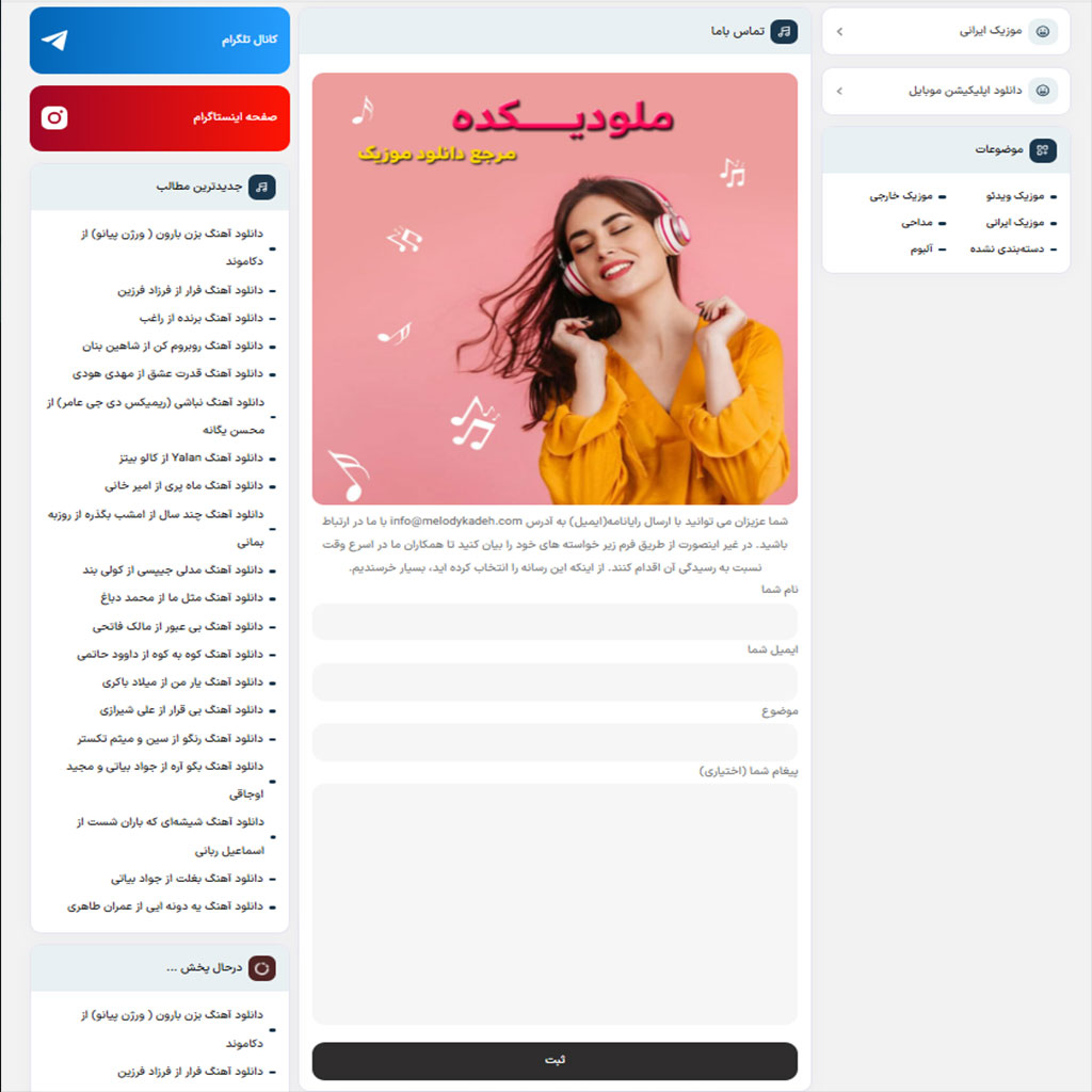 در این سایت جذاب و زیبا در صفحات تکی موزیک و آلبوم سعی بر این شده تمامی امکانات و بخش های مورد نظر طراحی و پیاده سازی شده این بخش های شامل: نمایش نام فارسی و انگلیسی، نام خواننده، دسته بندی های موزیک، شعر و ترانه آهنگ، نام شاعر، زمان آهنگ، تعداد بازدید آن، موزیک ویدئو (در صورت تمایل و وجود)، بخش دانلود اهنگ با کیفیت های 128 و 320 و… می باشد.