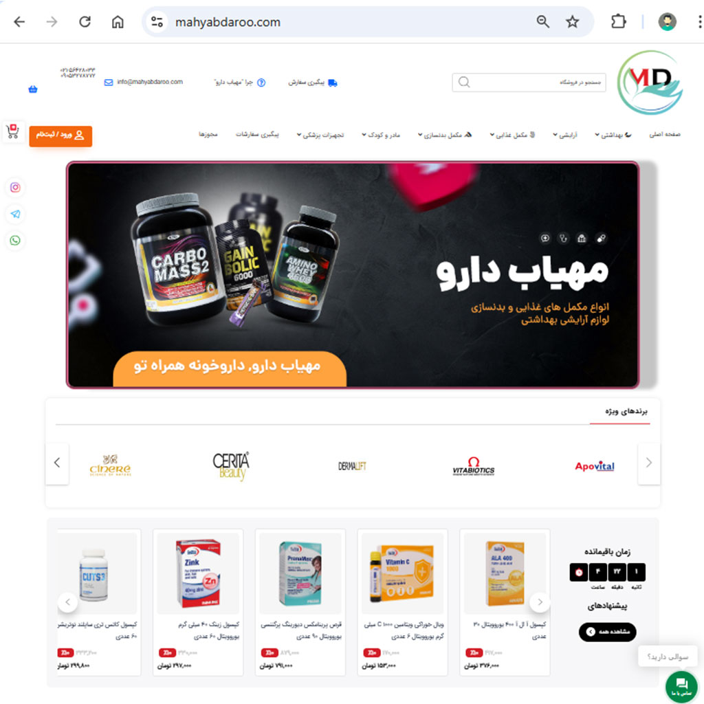 وبسایتی که در حال حاضر در پیش روی شماست، یک وبسایت فروشگاهی در بستر وردپرس است که در زمینه فروش دارو فعالیت دارد. کلیه پروسه طراحی، صفحه چینی، دریافت مجوزهای نماد اعتماد الکترونیک، نشان طلایی ساماندهی پایگاه های اینترنتی، درگاه پرداخت الکترونیکی تا زمان دریافت اولین سفارش، به مدت یک ماه به طول انجامید. کلیه امکاناتی که یک فروشگاه آنلاین به آن نیاز دارد مانند: مقایسه محصولات، سبد خرید، صفحه پرداخت، ورود و ثبت نام کاربران از طریق پیامک، نقد و بررسی محصولات و بسیاری از امکانات دیگر؛ در این پروژه دیده شده است.